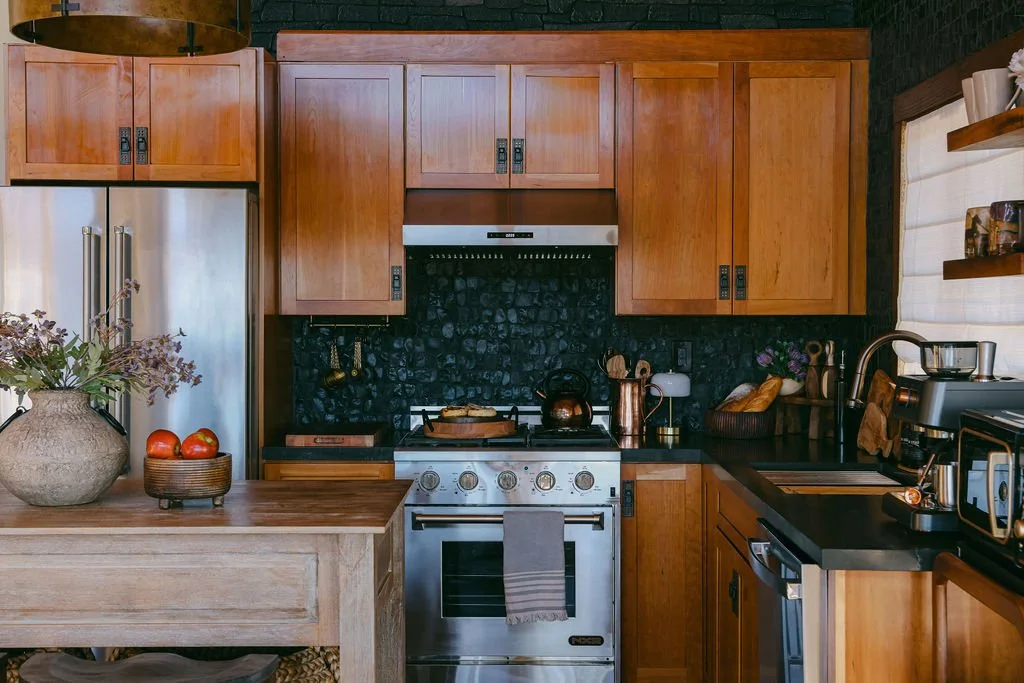 Two-story luxury design. The interiors feature a Western-luxe aesthetic - reclaimed wood, Helix Luxe mattresses, Parachute linens, and a fully stocked chef's kitchen with a professional range.